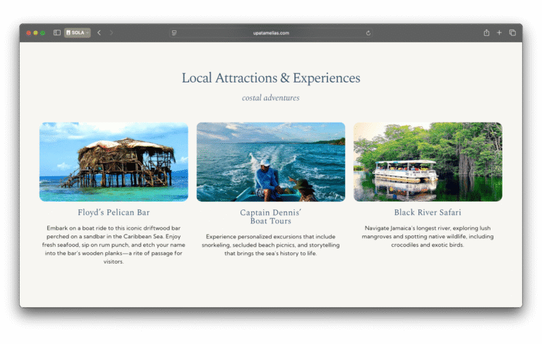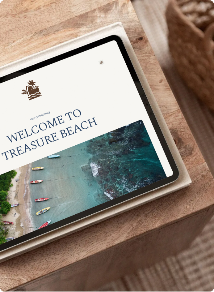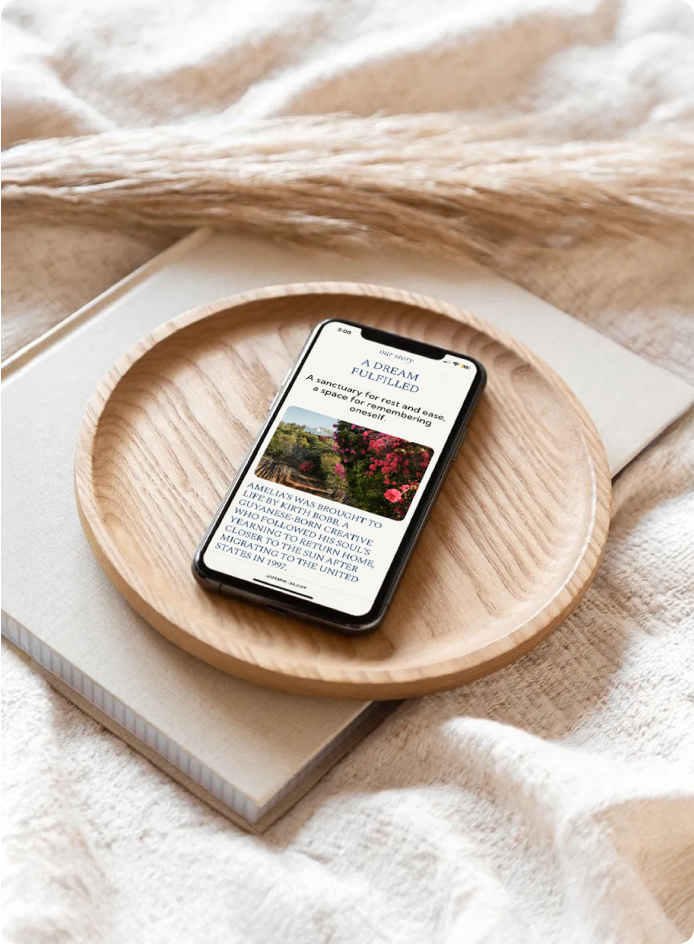 The color palette remains restrained—ocean blues, warm earth, the textures of wood and stone—each chosen to echo the landscape of Treasure Beach. Typography shifts between the grace of serif headlines and the clarity of unadorned sans-serif text, balancing elegance with ease. Together, design and language hold Amelia’s as a dwelling translated into love, memory, and welcome, where the spirit of the Caribbean is gathered and kept.